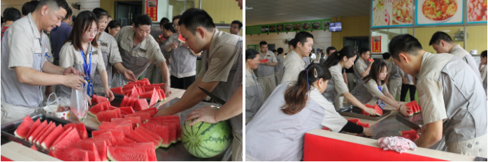 開餐時間到了,員工陸續來到餐廳,帶著一身暑氣,拿起西瓜咬了一口,從他們豆大汗珠的臉上,能感受到那份幸福與清涼。